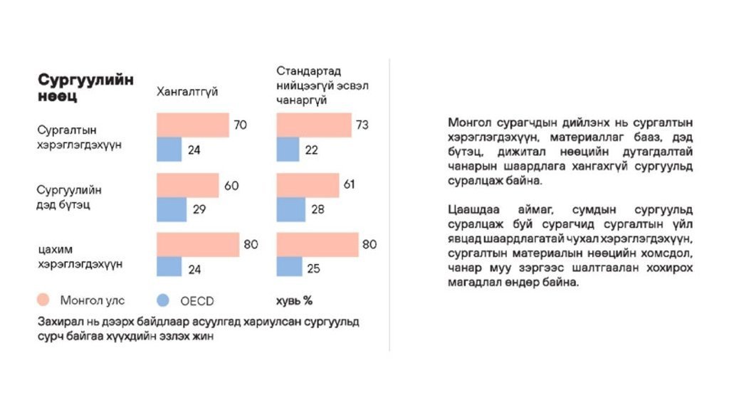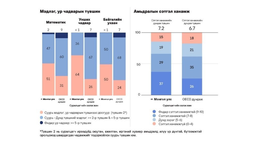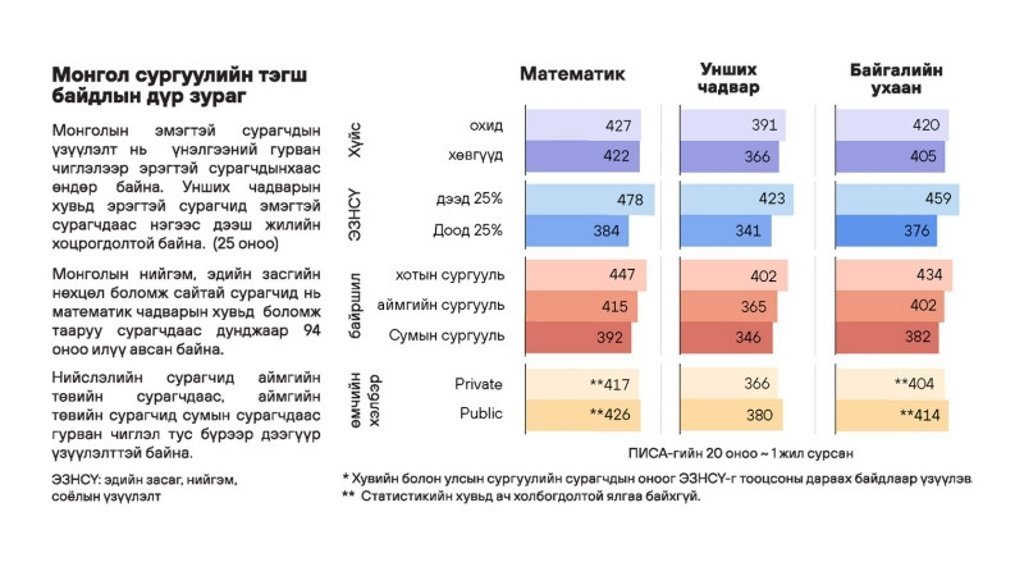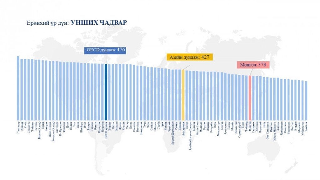 Унших чадварын тухайд 81 орноос 65 дугаарт эрэмбэлэгдсэн. Уншиж ойлгох, өөрийгөө илэрхийлэх, эргэцүүлж бичих, дүгнэлт хийх ур чадвар тааруу гэж дүгнэжээ. Oлон улсын дундаж хэмжээнээс 5 орчим жил, Азийн дундаж хүүхдүүдээс 2.5 жилээр хоцорч байна.