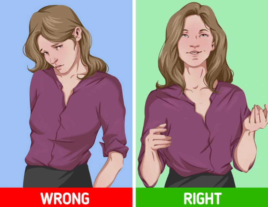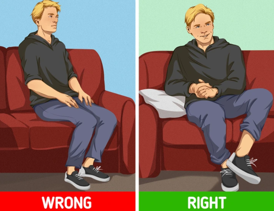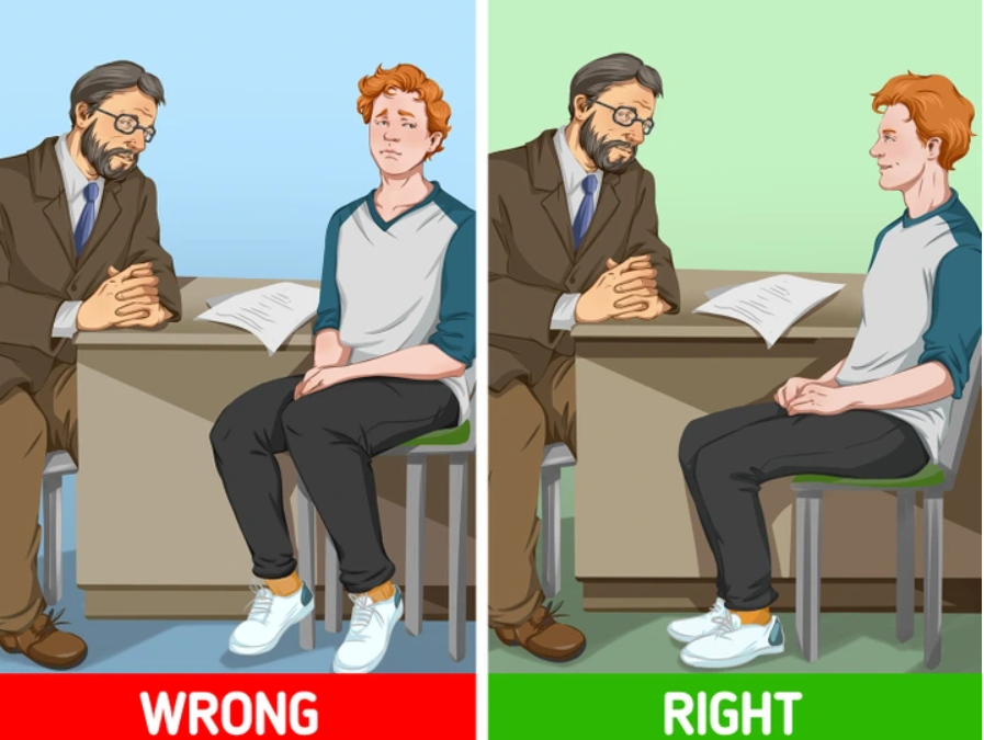 Та уулзалт, ажлын ярилцлагад орохдоо өөртөө итгэлтэй байдлаа илэрхийлэхийн тулд эгц суух хэрэгтэй. Мөн хөлдөө бага зэргийн зай авах эсвэл гараа сул байлгах нь нээлттэй нэгэн гэдгийг илтгэнэ. Харин бөхийж суун, толгой гудайлгах нь ичимхий байдлыг илтгэнэ.