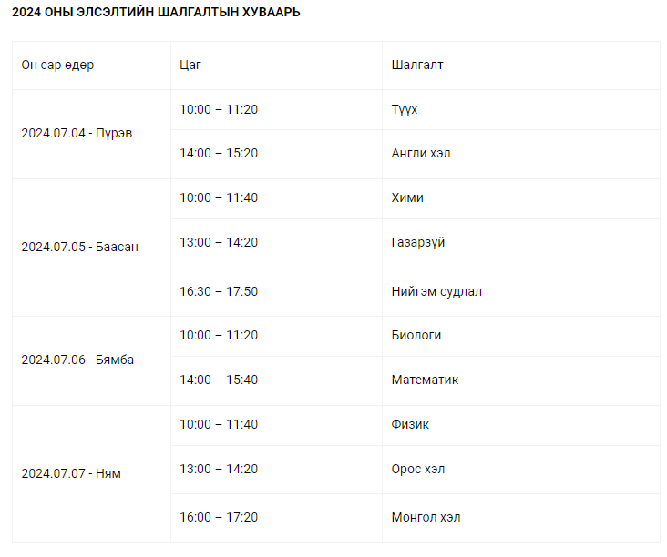 2024 оны сонгуультай холбоотойгоор шалгалтын хугацаанд бага зэрэг өөрчлөлт оржээ. Тодруулбал, 2024 оны долоодугаар сарын 4-7-ны хооронд дараах байдлаар шалгалтууд авна.