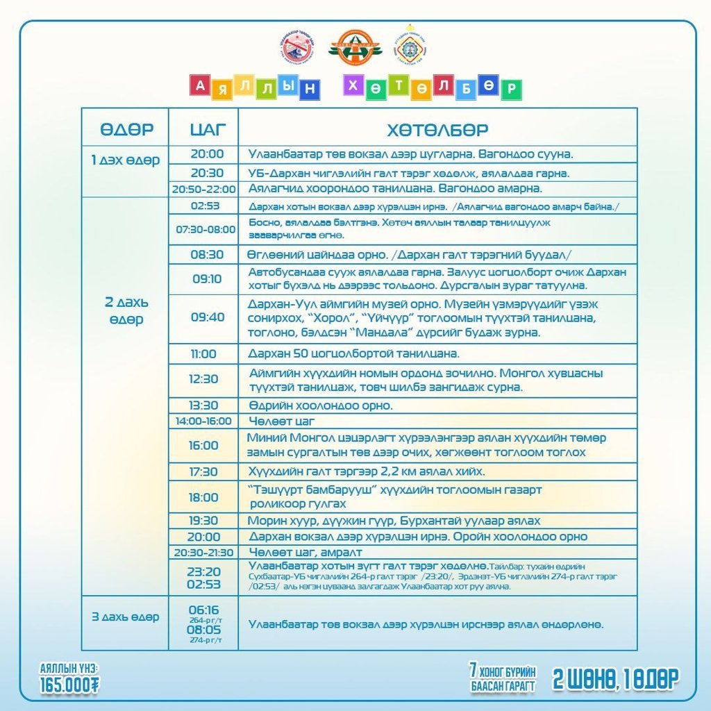 2024 оны гуравдугаар сарын 15, 22, 29-ний өдрүүдэд Улаанбаатар-Дархан-Улаанбаатар чиглэлд аялна. Дэлгэрэнгүй мэдээллийг: 21-242645, 99088240, 99161739, 98118596, 99193876 утсаар авах боломжтой.