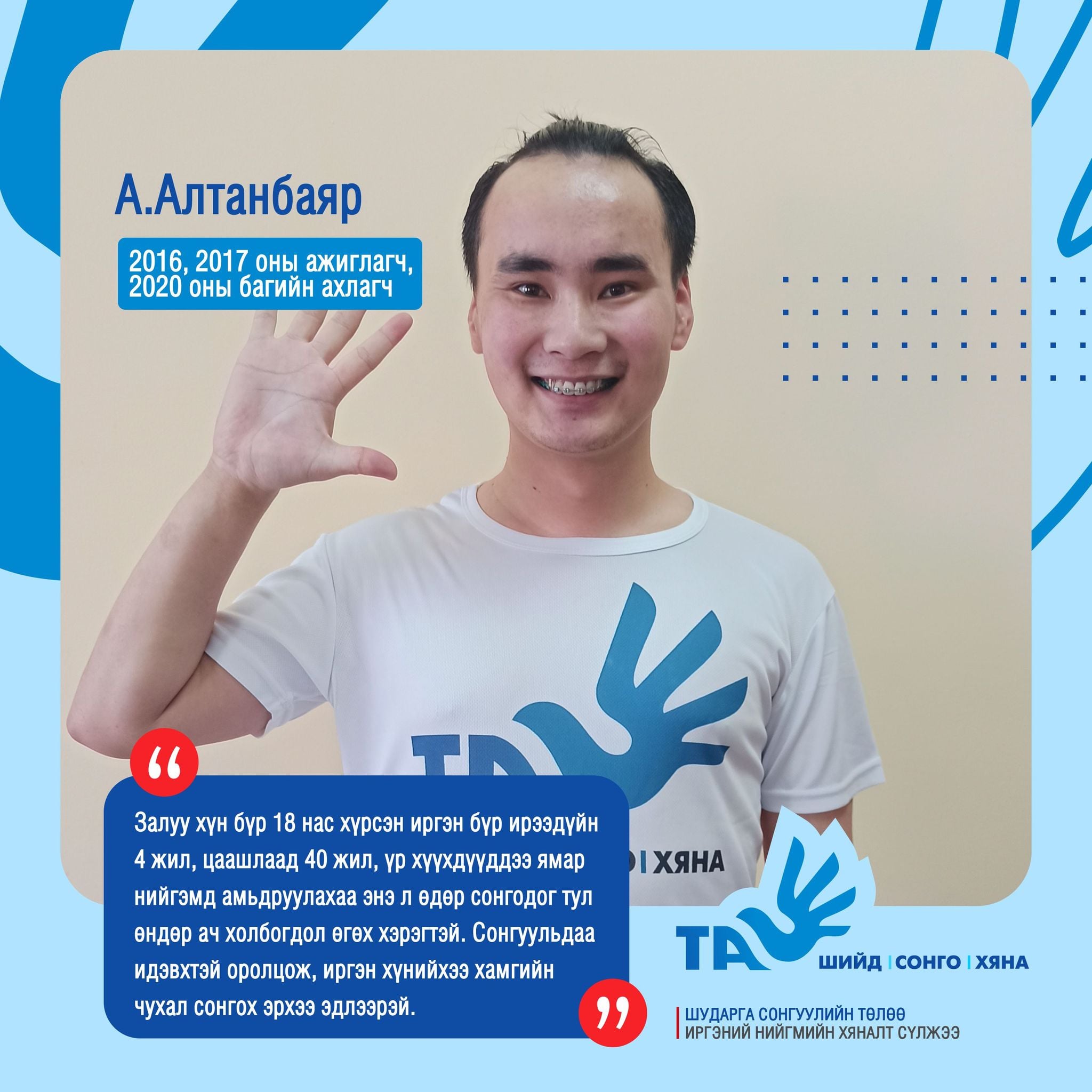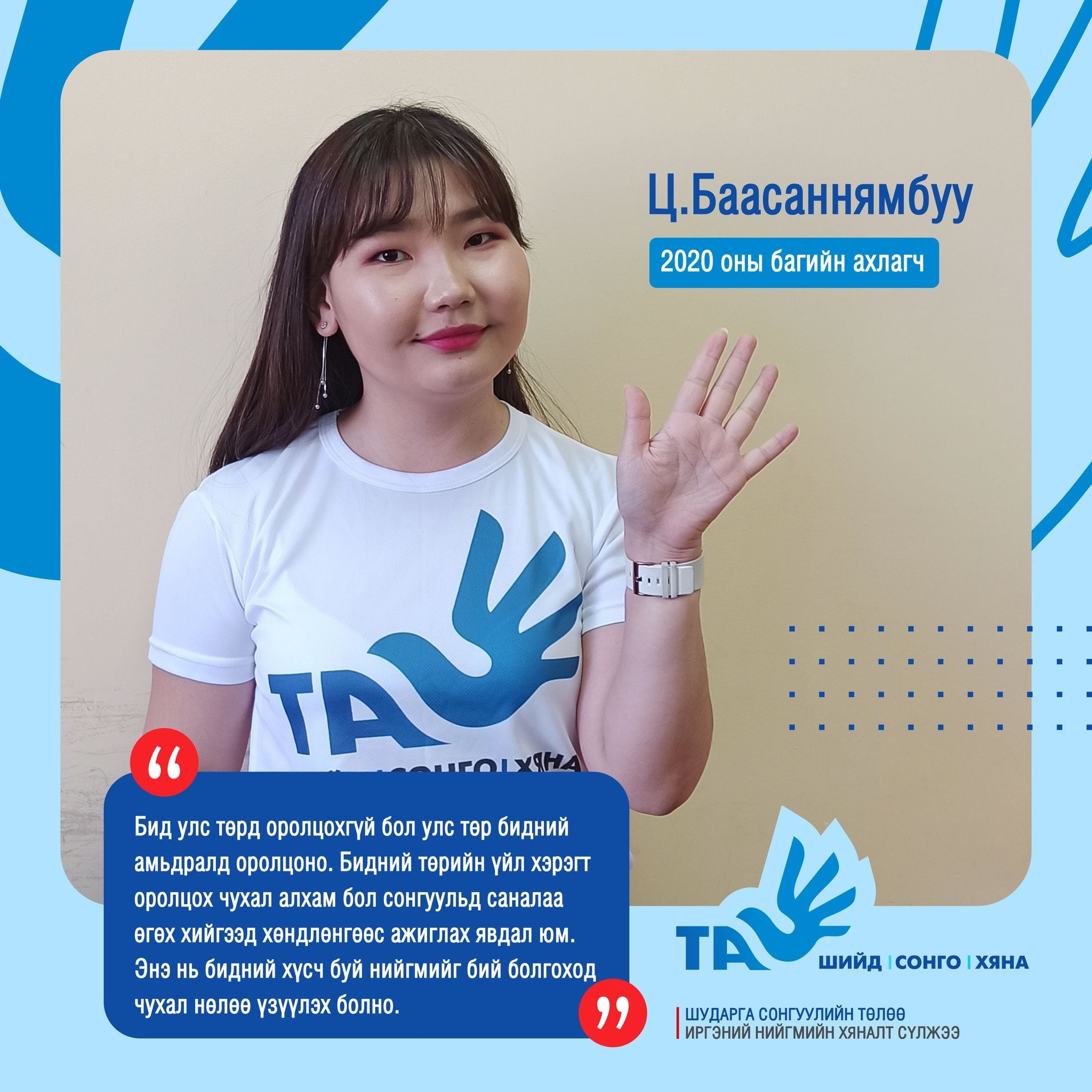Дашрамд сонирхуулахад, энэ байгууллага таныг УИХ-ын сонгуульд ажиглагчаар ажилласныг тодорхойлсон сертификатыг англи хэл дээр гардуулна. Эхэнд хэлсэнчлэн, хувь хүний түүх гэдэг маш чухал. Хэрэв гадагшаа сургуульд апплайдах гэж байгаа бол, гадны аль нэгэн байгууллагад ажиллах гэж байгаа бол, бүхэл бүтэн иргэний нийгмээ төлөөлөн сонгуульд ажилласан гэх энэ сертификат таны насан туршийн амьдралд хэрэг болох болно.