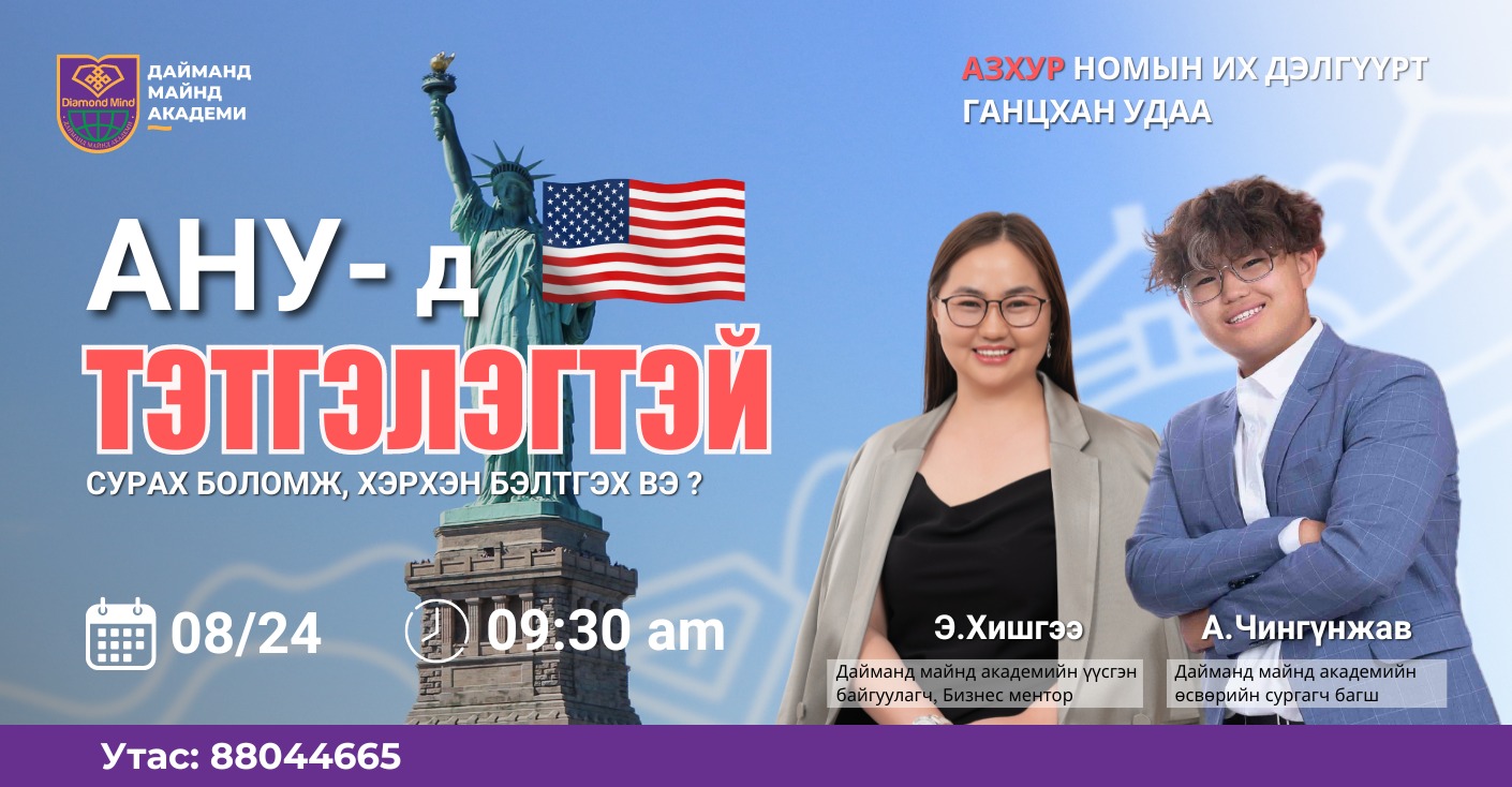 Тайлбар: Дайманд майнд академийн үүсгэн байгуулагч Э.Хишгээ, түүний хүү А.Чингүнжав нар Америк улсад сар орчим хугацаанд 4 хот 11 сургуулиар орж тэтгэлэгтэй сурах боломж, амьдрах орчин нөхцөлийн талаар судалгаа хийсэн бөгөөд судалгааны мэдээллээ хуваалцах болно.