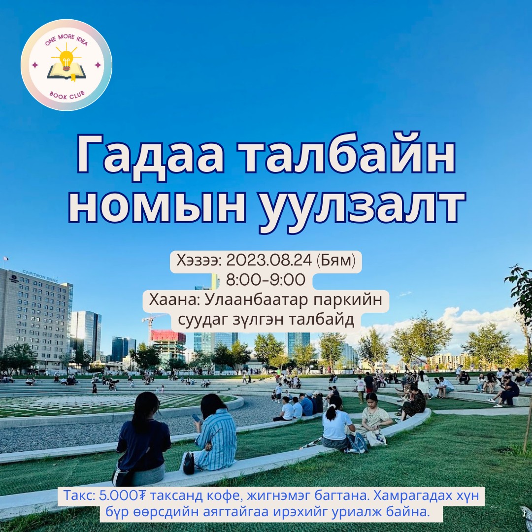 Тайлбар: ОМИ номын клубээс зохион байгуулж буй ГАДАА ТАЛБАЙН номын уулзалтад урьж байна.